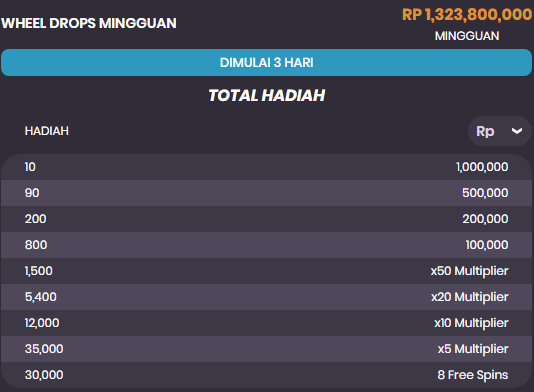 3. Wheel drops akan berlangsung setiap minggu, mulai Senin, pukul 00:00 hingga Minggu, pukul 23:59 (WIB) dengan 85,000 hadiah dan total hadiah senilai Rp 1,323,800,000 setiap minggunya.