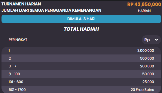 3. Turnamen harian akan berlangsung dari 20:00 hingga 23:59 WIB, dengan 1,700 hadiah harian senilai Rp 43,650,000. Akan ada 28 turnamen selama periode promosi.