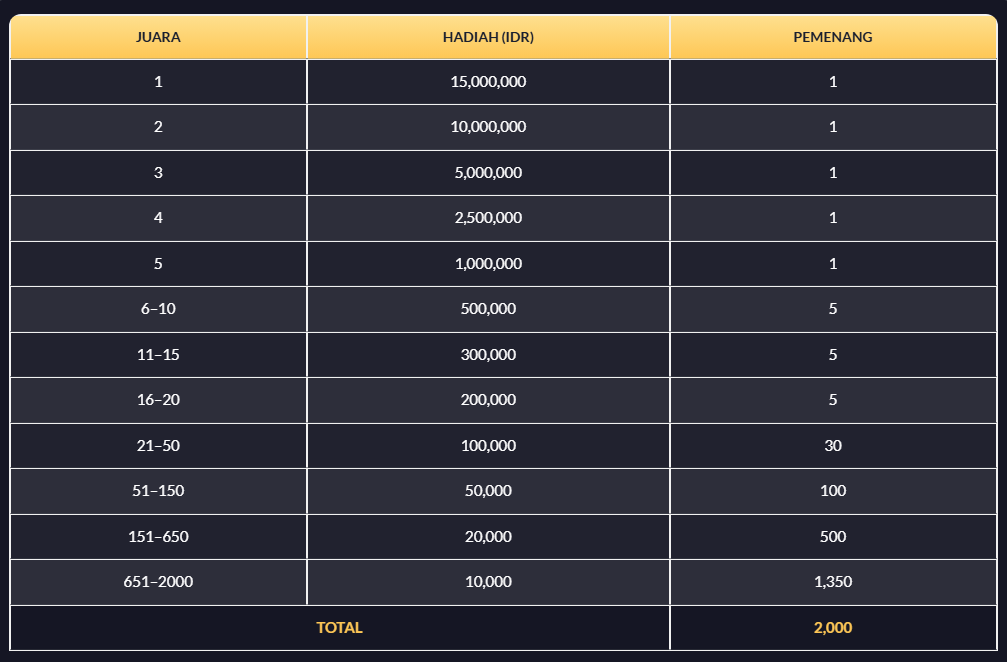 2. Total hadiah sebesar Rp 1,400,000,000 akan dibagikan kepada 40.000 Pemenang selama periode event berlangsung, dengan kuota 2.000 Pemenang setiap hari.